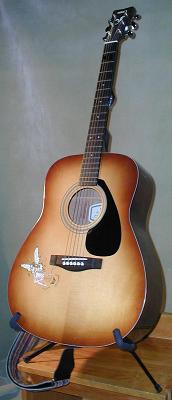 - The Story: This was my second guitar. After spending a lot of time with Meddle, I gradually acquired the desire to own an acoustic guitar, especially after my little brother started playing guitar and had an acoustic of his own. I'm pretty sure I bought this after Christmas in early 2005 (or possibly late December 2004). I made a point of buying a guitar that was completely hollow and without any cutaways. I wanted it to be genuinely 100% acoustic, which is why I didn't bother to look at any acoustic/electrics, either. I had an electric guitar already, and I just wanted one that was, as I said, 100% acoustic. I picked up this one, and it had such a warm and beautiful tone, I knew it was the one I was looking for. I named it after what the sticker was called that I put on it - Rhapsody.